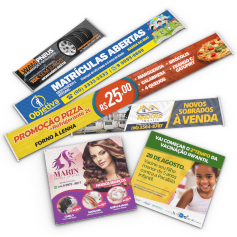 Os banners, faixas e lonas personalizadas são materiais gráficos ideais para divulgar sua marca, atrair clientes e destacar promoções. Produzidos com impressão digital de alta qualidade, oferecem cores vibrantes, excelente definição e resistência, garantindo comunicação visual marcante em qualquer ocasião.